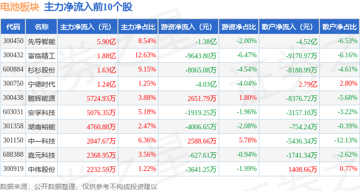 从资金流向上来看,当日电池板块主力资金净流出43.69亿元,游资资金净流入7.66亿元,散户资金净流入36.03亿元。电池板块个股资金流向见下表: