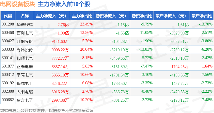 从资金流向上来看,当日电网设备板块主力资金净流出15.81亿元,游资资金净流出3.6亿元,散户资金净流入19.41亿元。电网设备板块个股资金流向见下表: