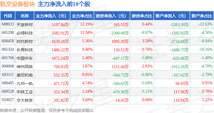 从资金流向上来看,当日轨交设备板块主力资金净流入2055.01万元,游资资金净流出3010.32万元,散户资金净流入955.32万元。轨交设备板块个股资金流向见下表: