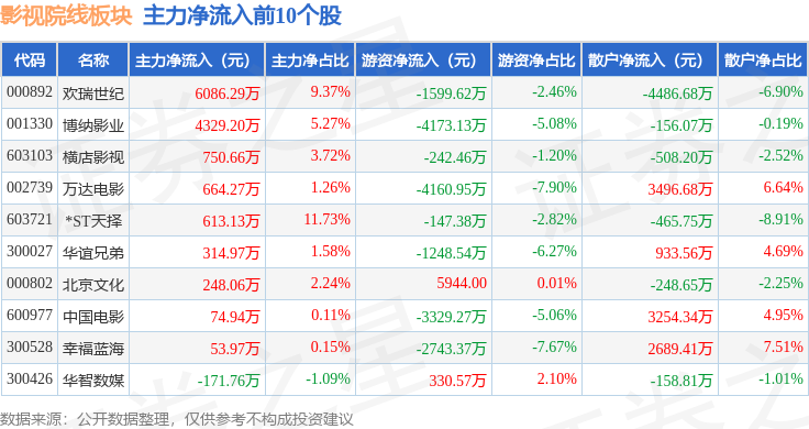 从资金流向上来看,当日影视院线板块主力资金净流出7456.67万元,游资资金净流出1.41亿元,散户资金净流入2.16亿元。影视院线板块个股资金流向见下表: