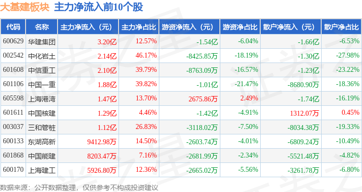 从资金流向上来看,当日大基建板块主力资金净流入12.67亿元,游资资金净流出9.03亿元,散户资金净流出3.64亿元。大基建板块个股资金流向见下表: