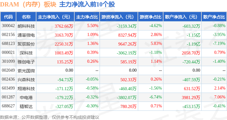 从资金流向上来看,当日DRAM(内存)板块主力资金净流出45.62亿元,游资资金净流入13.92亿元,散户资金净流入31.69亿元。DRAM(内存)板块个股资金流向见下表: