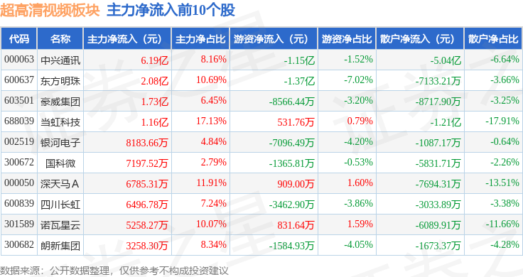 从资金流向上来看,当日超高清视频板块主力资金净流出10.09亿元,游资资金净流入6228.32万元,散户资金净流入9.47亿元。超高清视频板块个股资金流向见下表: