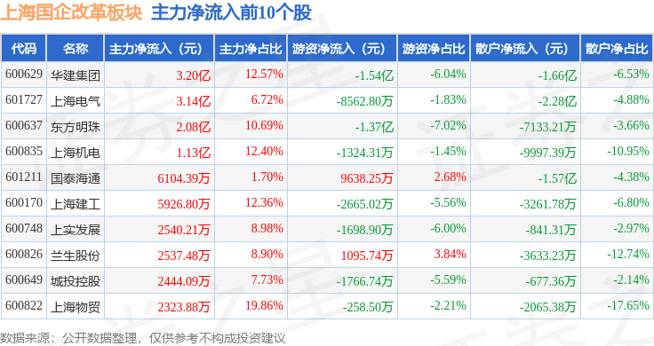 从资金流向上来看,当日上海国企改革板块主力资金净流入5.11亿元,游资资金净流出2.39亿元,散户资金净流出2.72亿元。上海国企改革板块个股资金流向见下表: