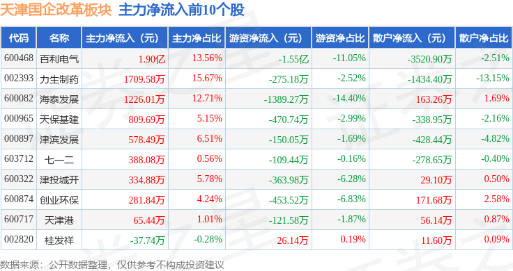 从资金流向上来看,当日天津国企改革板块主力资金净流入2.35亿元,游资资金净流出1.9亿元,散户资金净流出4566.64万元。天津国企改革板块个股资金流向见下表: