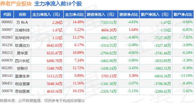 从资金流向上来看,当日养老产业板块主力资金净流入4.48亿元,游资资金净流出3.3亿元,散户资金净流出1.18亿元。养老产业板块个股资金流向见下表: