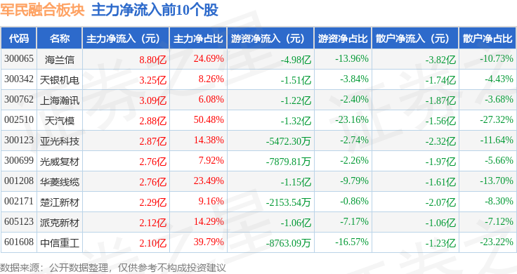 从资金流向上来看,当日军民融合板块主力资金净流入41.8亿元,游资资金净流出19.85亿元,散户资金净流出21.95亿元。军民融合板块个股资金流向见下表: