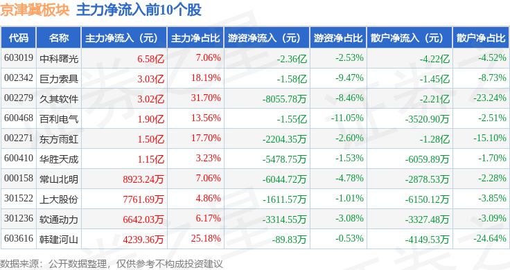从资金流向上来看,当日京津冀板块主力资金净流出3.1亿元,游资资金净流出8.2亿元,散户资金净流入11.3亿元。京津冀板块个股资金流向见下表: