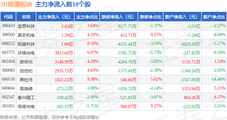 从资金流向上来看,当日3D玻璃板块主力资金净流出7951.22万元,游资资金净流出7479.23万元,散户资金净流入1.54亿元。3D玻璃板块个股资金流向见下表: