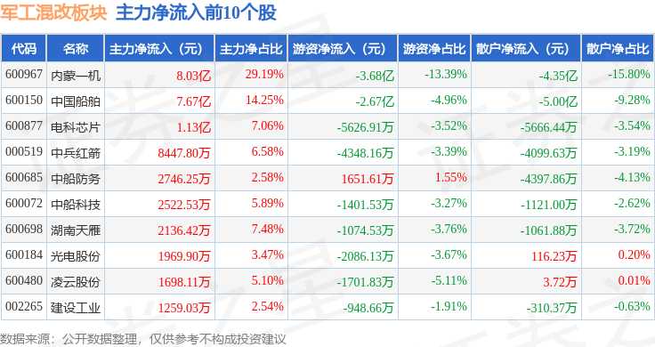 从资金流向上来看,当日军工混改板块主力资金净流入11.51亿元,游资资金净流出4.05亿元,散户资金净流出7.46亿元。军工混改板块个股资金流向见下表: