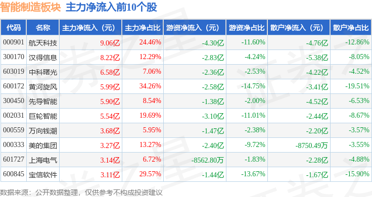 从资金流向上来看,当日智能制造板块主力资金净流入20.59亿元,游资资金净流出28.08亿元,散户资金净流入7.49亿元。智能制造板块个股资金流向见下表: