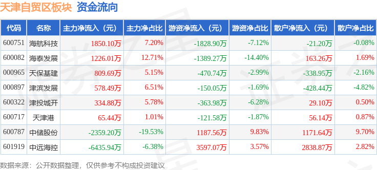 从资金流向上来看,当日天津自贸区板块主力资金净流出3930.54万元,游资资金净流入460.11万元,散户资金净流入3470.43万元。天津自贸区板块个股资金流向见下表: