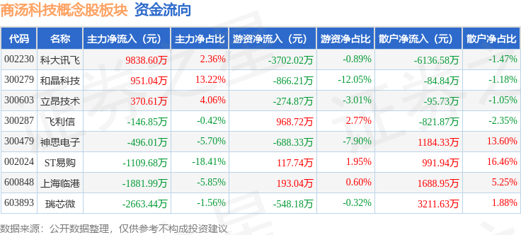 从资金流向上来看,当日商汤科技概念股板块主力资金净流入4862.29万元,游资资金净流出4800.11万元,散户资金净流出62.17万元。商汤科技概念股板块个股资金流向见下表: