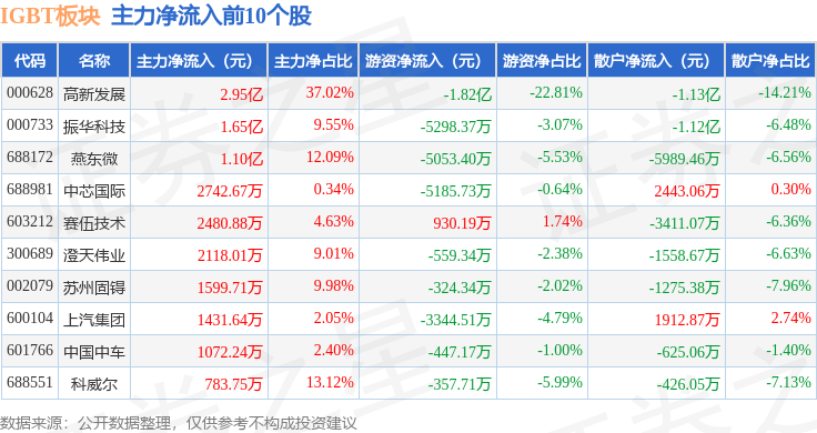从资金流向上来看,当日IGBT板块主力资金净流出11.28亿元,游资资金净流入1.47亿元,散户资金净流入9.81亿元。IGBT板块个股资金流向见下表: