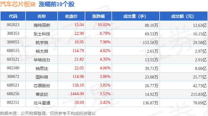 证券之星消息,1月8日汽车芯片板块较上一交易日上涨0.81%,海特高新领涨。当日上证指数报收于4082.98,下跌0.07%。深证成指报收于13959.48,下跌0.51%。汽车芯片板块个股涨跌见下表: