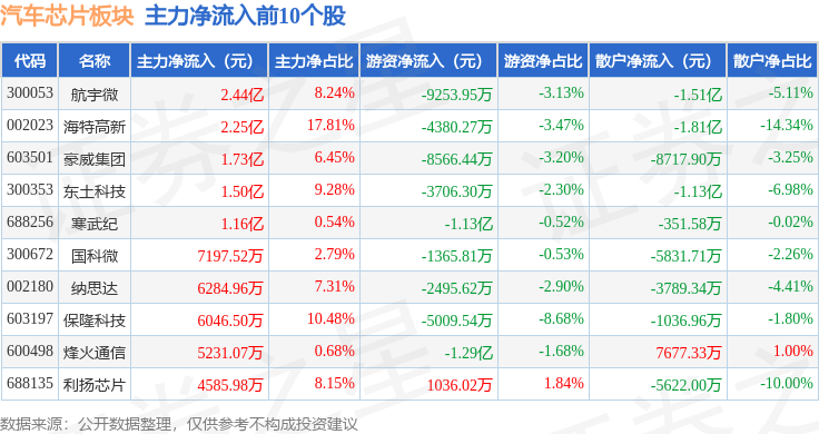 从资金流向上来看,当日汽车芯片板块主力资金净流出31.07亿元,游资资金净流入7.68亿元,散户资金净流入23.4亿元。汽车芯片板块个股资金流向见下表: