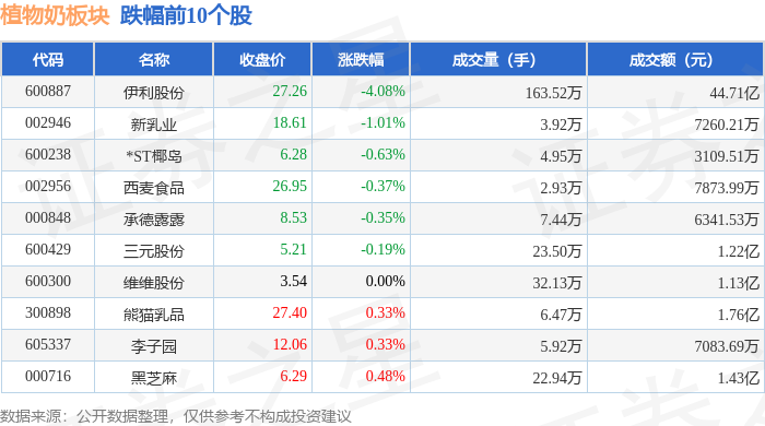 证券之星消息,1月8日植物奶板块较上一交易日下跌2.07%,伊利股份领跌。当日上证指数报收于4082.98,下跌0.07%。深证成指报收于13959.48,下跌0.51%。植物奶板块个股涨跌见下表: