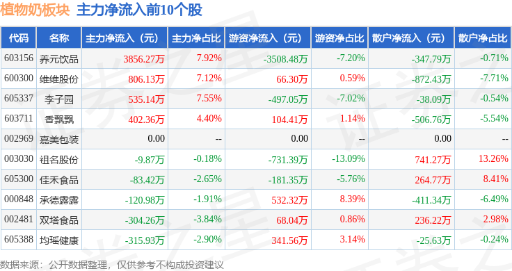 从资金流向上来看,当日植物奶板块主力资金净流出2.11亿元,游资资金净流入91.57万元,散户资金净流入2.1亿元。植物奶板块个股资金流向见下表: