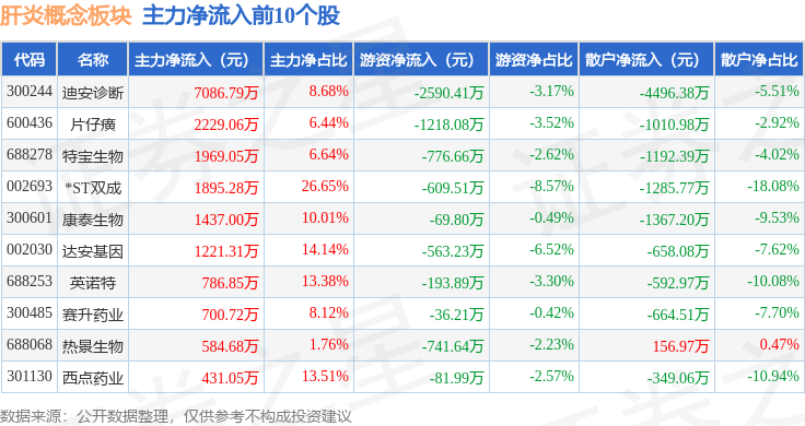 从资金流向上来看,当日肝炎概念板块主力资金净流入1711.35万元,游资资金净流出8407.85万元,散户资金净流入6696.5万元。肝炎概念板块个股资金流向见下表: