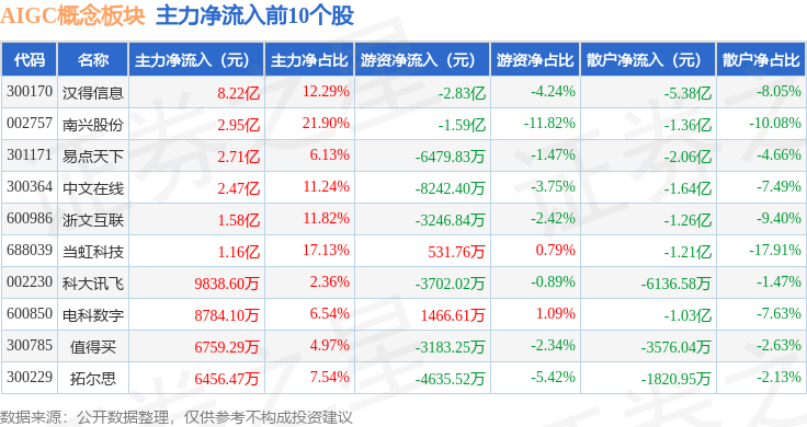 从资金流向上来看,当日AIGC概念板块主力资金净流入1.19亿元,游资资金净流出1.68亿元,散户资金净流入4815.12万元。AIGC概念板块个股资金流向见下表: