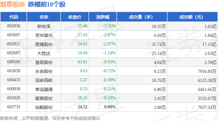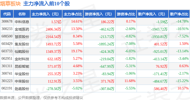 从资金流向上来看,当日烟草板块主力资金净流出2.91亿元,游资资金净流入3625.13万元,散户资金净流入2.55亿元。烟草板块个股资金流向见下表:
