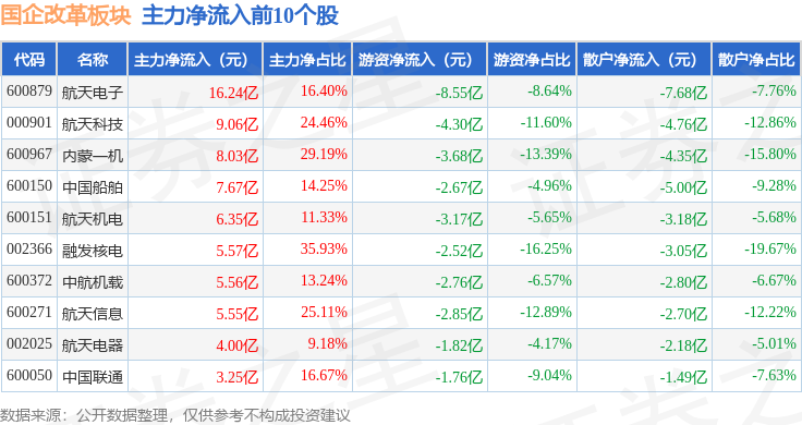 从资金流向上来看,当日国企改革板块主力资金净流入11.16亿元,游资资金净流出53.18亿元,散户资金净流入42.02亿元。国企改革板块个股资金流向见下表: