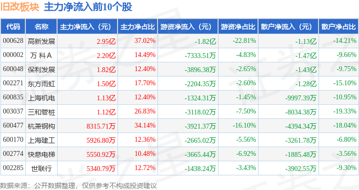 从资金流向上来看,当日旧改板块主力资金净流入10.66亿元,游资资金净流出7.35亿元,散户资金净流出3.3亿元。旧改板块个股资金流向见下表: