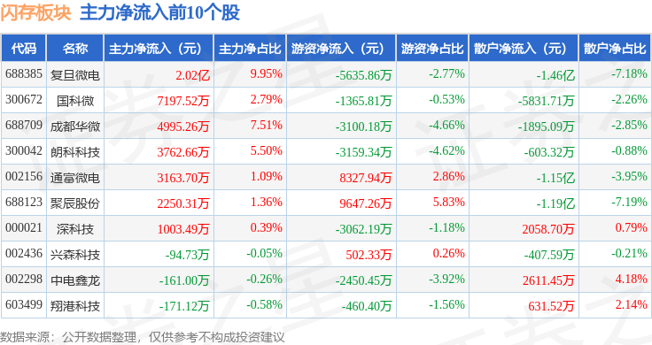 从资金流向上来看,当日闪存板块主力资金净流出44.1亿元,游资资金净流入15.24亿元,散户资金净流入28.86亿元。闪存板块个股资金流向见下表: