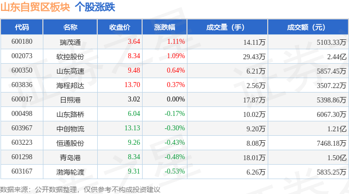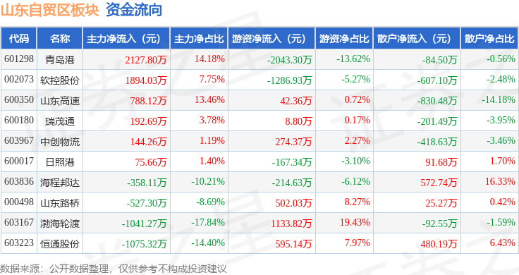 从资金流向上来看,当日山东自贸区板块主力资金净流入2220.55万元,游资资金净流出1155.68万元,散户资金净流出1064.87万元。山东自贸区板块个股资金流向见下表:
