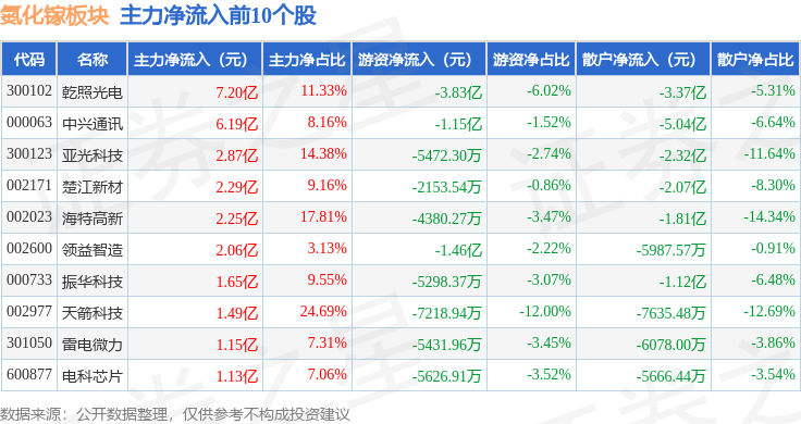 从资金流向上来看,当日氮化镓板块主力资金净流出31.91亿元,游资资金净流入9.92亿元,散户资金净流入22.0亿元。氮化镓板块个股资金流向见下表: