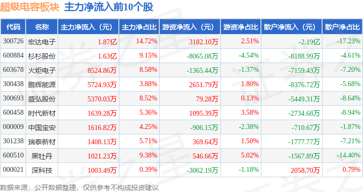 从资金流向上来看,当日超级电容板块主力资金净流出3.57亿元,游资资金净流入1.86亿元,散户资金净流入1.71亿元。超级电容板块个股资金流向见下表: