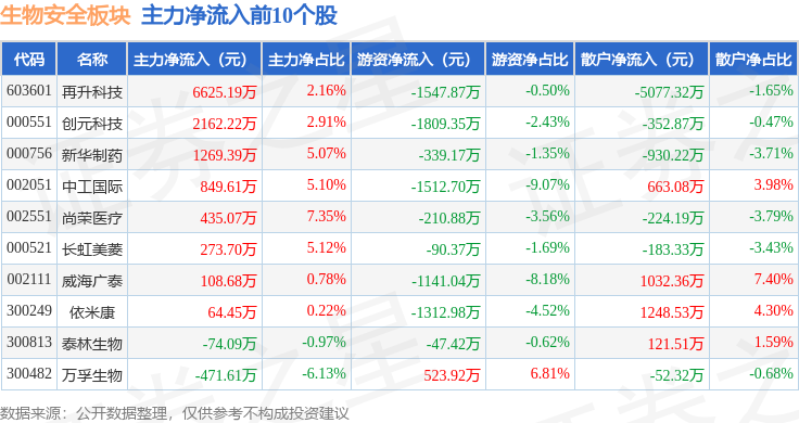 从资金流向上来看,当日生物安全板块主力资金净流出4926.29万元,游资资金净流出7713.12万元,散户资金净流入1.26亿元。生物安全板块个股资金流向见下表: