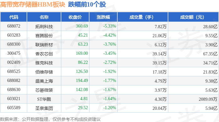 证券之星消息,1月8日高带宽存储器HBM板块较上一交易日下跌0.86%,拓荆科技领跌。当日上证指数报收于4082.98,下跌0.07%。深证成指报收于13959.48,下跌0.51%。高带宽存储器HBM板块个股涨跌见下表: