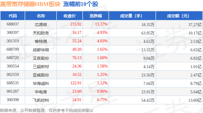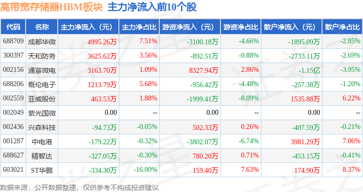 从资金流向上来看,当日高带宽存储器HBM板块主力资金净流出25.85亿元,游资资金净流入8.57亿元,散户资金净流入17.28亿元。高带宽存储器HBM板块个股资金流向见下表:
