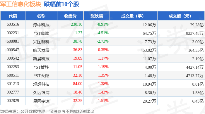 从资金流向上来看,当日军工信息化板块主力资金净流出10.23亿元,游资资金净流出1.89亿元,散户资金净流入12.12亿元。军工信息化板块个股资金流向见下表: