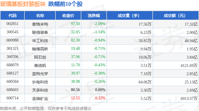 证券之星消息,1月8日玻璃基板封装板块较上一交易日下跌0.12%,麦格米特领跌。当日上证指数报收于4082.98,下跌0.07%。深证成指报收于13959.48,下跌0.51%。玻璃基板封装板块个股涨跌见下表: