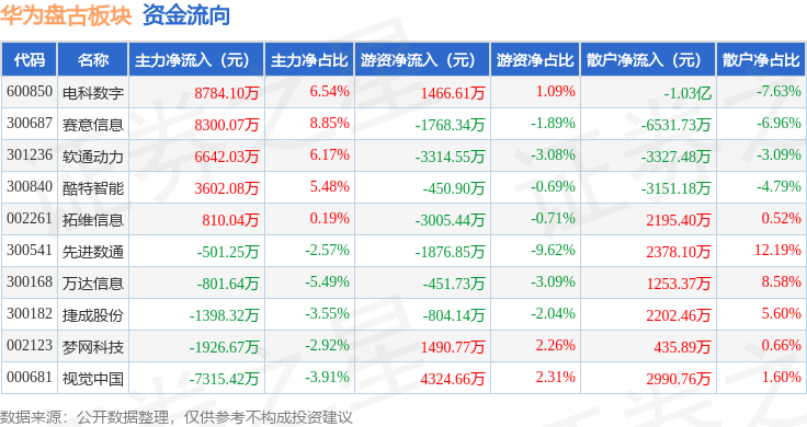 从资金流向上来看,当日华为盘古板块主力资金净流入1.62亿元,游资资金净流出4389.9万元,散户资金净流出1.18亿元。华为盘古板块个股资金流向见下表: