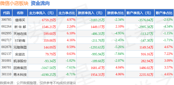 从资金流向上来看,当日微信小店板块主力资金净流入2036.89万元,游资资金净流出1275.47万元,散户资金净流出761.41万元。微信小店板块个股资金流向见下表: