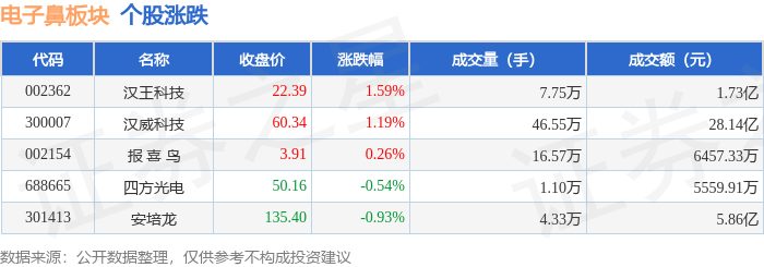 证券之星消息,1月8日电子鼻板块较上一交易日上涨0.47%,汉王科技领涨。当日上证指数报收于4082.98,下跌0.07%。深证成指报收于13959.48,下跌0.51%。电子鼻板块个股涨跌见下表: