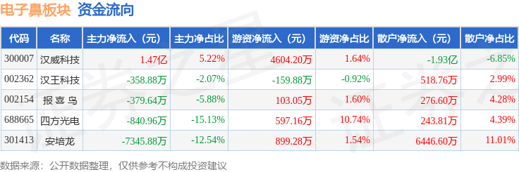 从资金流向上来看,当日电子鼻板块主力资金净流入5748.92万元,游资资金净流入6043.81万元,散户资金净流出1.18亿元。电子鼻板块个股资金流向见下表:
