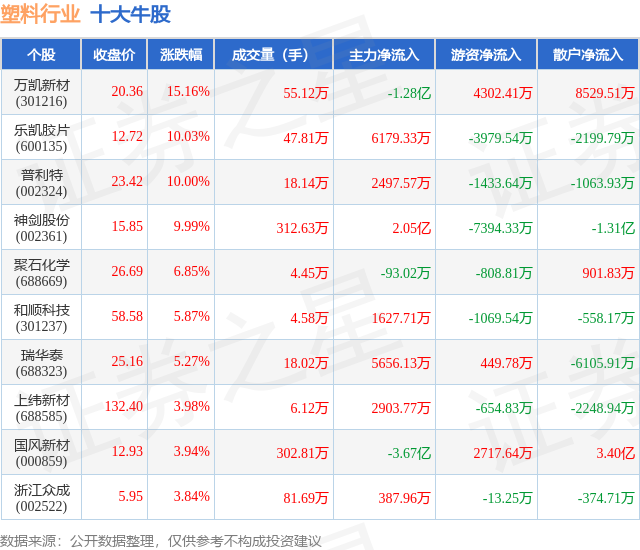 个股表现方面,塑料行业当日领涨股为万凯新材(301216),该股当日报收20.36,上涨15.16%,成交量55.12万,主力资金净流出1.28亿元。乐凯胶片(600135)以上涨10.03%紧随其后,该股当日成交量47.81万,主力资金净流入6179.33万元。除此之外,普利特(002324)、神剑股份(002361)、聚石化学(688669)均进入当日牛股之列。具体个股列表见下表: