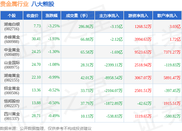 个股表现方面,贵金属行业当日领跌股为湖南白银(002716),该股当日报收7.73,下跌3.25%,成交量286.86万,主力资金净流出3.15亿元。赤峰黄金(600988)以下跌1.93%紧随其后,该股当日成交量66.88万,主力资金净流出2.12亿元。除此之外,中金黄金(600489)、山金国际(000975)、湖南黄金(002155)均进入当日熊股之列。具体个股列表见下表: