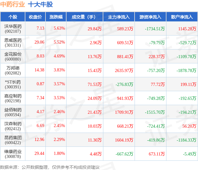 个股表现方面,中药行业当日领涨股为沃华医药(002107),该股当日报收7.13,上涨5.63%,成交量29.84万,主力资金净流入589.23万元。恩威医药(301331)以上涨5.52%紧随其后,该股当日成交量2.96万,主力资金净流入609.51万元。除此之外,金花股份(600080)、万邦德(002082)、*ST长药(300391)均进入当日牛股之列。具体个股列表见下表: