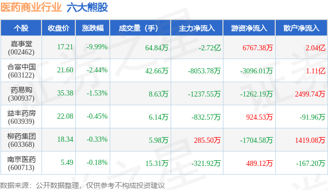 个股表现方面,医药商业行业当日领跌股为嘉事堂(002462),该股当日报收17.21,下跌9.99%,成交量64.84万,主力资金净流出2.72亿元。合富中国(603122)以下跌2.44%紧随其后,该股当日成交量42.66万,主力资金净流出8053.78万元。除此之外,药易购(300937)、益丰药房(603939)、柳药集团(603368)均进入当日熊股之列。具体个股列表见下表: