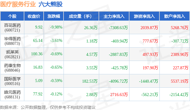 个股表现方面,医疗服务行业当日领跌股为百花医药(600721),该股当日报收9.92,下跌9.98%,成交量26.36万,主力资金净流出7308.63万元。毕得医药(688073)以下跌3.61%紧随其后,该股当日成交量1.18万,主力资金净流出469.94万元。除此之外,凯莱英(002821)、药康生物(688046)、国际医学(000516)均进入当日熊股之列。具体个股列表见下表: