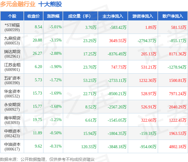 个股表现方面,多元金融行业当日领跌股为*ST熊猫(600599),该股当日报收8.54,下跌5.01%,成交量3.7万,主力资金净流出583.42万元。九鼎投资(600053)以下跌3.15%紧随其后,该股当日成交量23.29万,主力资金净流入3649.55万元。除此之外,瑞达期货(002961)、江苏金租(600901)、五矿资本(600390)均进入当日熊股之列。具体个股列表见下表: