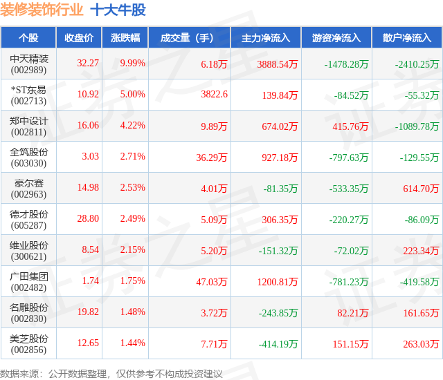 个股表现方面,装修装饰行业当日领涨股为中天精装(002989),该股当日报收32.27,上涨9.99%,成交量6.18万,主力资金净流入3888.54万元。*ST东易(002713)以上涨5.0%紧随其后,该股当日成交量3823.0,主力资金净流入139.84万元。除此之外,郑中设计(002811)、全筑股份(603030)、豪尔赛(002963)均进入当日牛股之列。具体个股列表见下表: