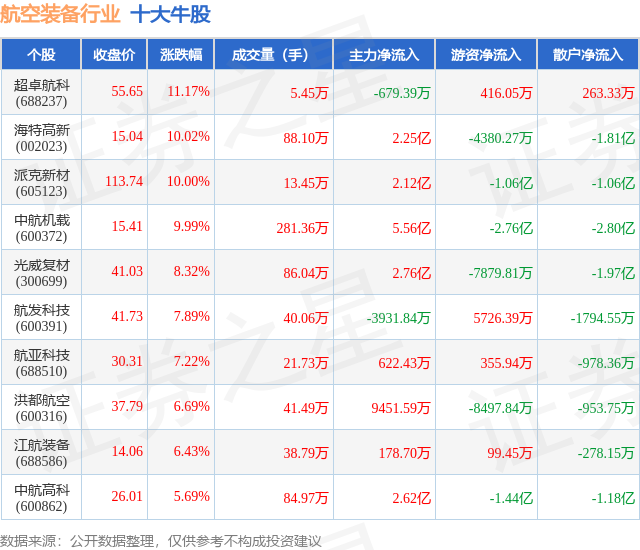 个股表现方面,航空装备行业当日领涨股为超卓航科(688237),该股当日报收55.65,上涨11.17%,成交量5.45万,主力资金净流出679.39万元。海特高新(002023)以上涨10.02%紧随其后,该股当日成交量88.1万,主力资金净流入2.25亿元。除此之外,派克新材(605123)、中航机载(600372)、光威复材(300699)均进入当日牛股之列。具体个股列表见下表: