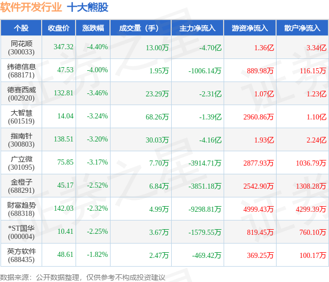 个股表现方面,软件开发行业当日领跌股为同花顺(300033),该股当日报收347.32,下跌4.4%,成交量13.0万,主力资金净流出4.7亿元。纬德信息(688171)以下跌4.0%紧随其后,该股当日成交量1.95万,主力资金净流出1006.14万元。除此之外,德赛西威(002920)、大智慧(601519)、指南针(300803)均进入当日熊股之列。具体个股列表见下表: