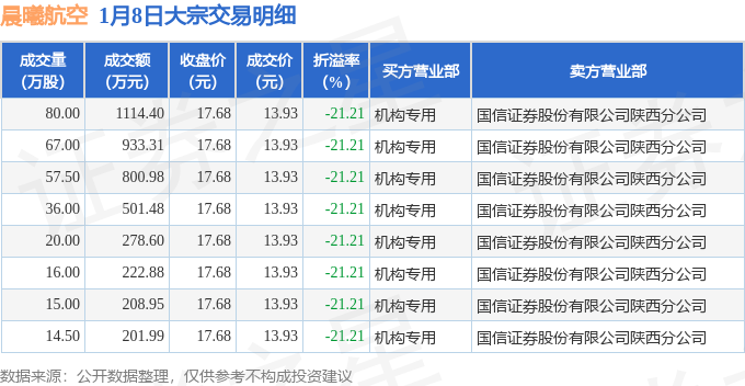 证券之星消息,1月8日晨曦航空发生大宗交易,交易数据如下:
